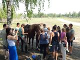 Рано утром автобус с юными всадниками приехал на базу и как только дети вышли на улицу, лица ребят озарились улыбками. Во дворе их ждали лошади: Кобыла по клички Ласточка и мерин по кличке Миро, которых Мы готовили к верховой прогулке.