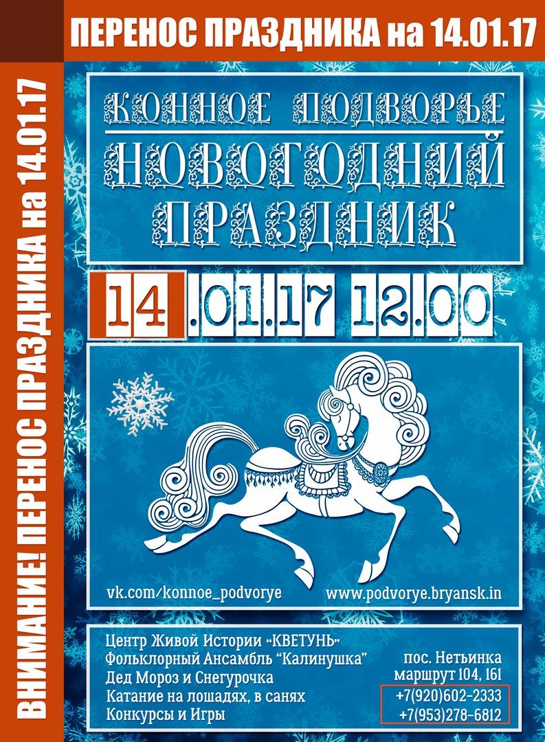 Уважаемые Гости, Подписчики нашей группы, Конники и Все, кто спешил к нам на Новогодний Праздник! Спешим сообщить, мы ПЕРЕНОСИМ НОВОГОДНИЙ ПРАЗДНИК на 14 января 2017 года в 12:00! Это СТАРЫЙ НОВЫЙ ГОД!