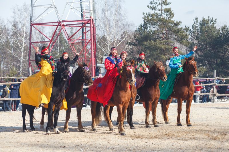 Русские красавицы верхом на лошадях устроили задорное показательное выступление конного театра. Катания на лошадях были доступны и для гостей масленичных гуляний.